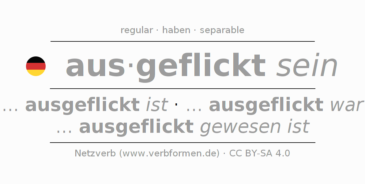 The conjugation of ausflicken in Participle Present Perfect part of speech Statal Passive is ausgeflickt seiend, ausgeflickt gewesen.The conjugation corresponds to certain grammatical rules. Likewise the requirements for the conjugation of the simple verb forms of ausflicken in Participle. Comments ☆