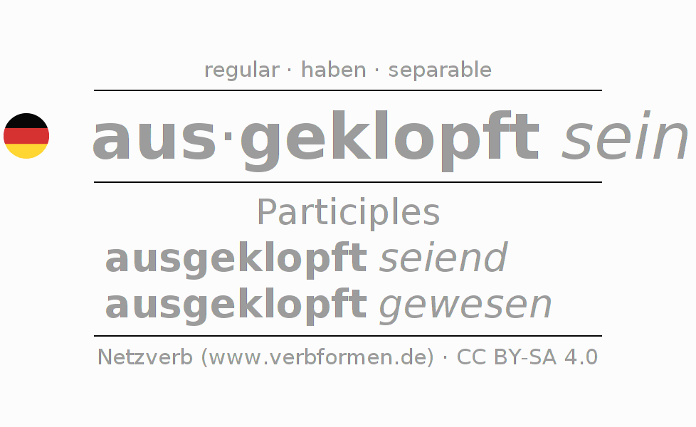 The conjugation of ausklopfen in Participle Present Perfect part of speech Statal Passive is ausgeklopft seiend, ausgeklopft gewesen.The conjugation corresponds to certain grammatical rules. Likewise the requirements for the conjugation of the simple verb forms of ausklopfen in Participle. Comments ☆