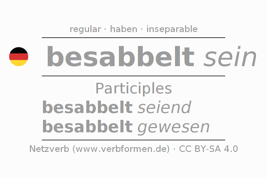 The conjugation of besabbeln in Participle Present Perfect part of speech Statal Passive is besabbelt seiend, besabbelt gewesen.The conjugation corresponds to certain grammatical rules. Likewise the requirements for the conjugation of the simple verb forms of besabbeln in Participle. Comments ☆