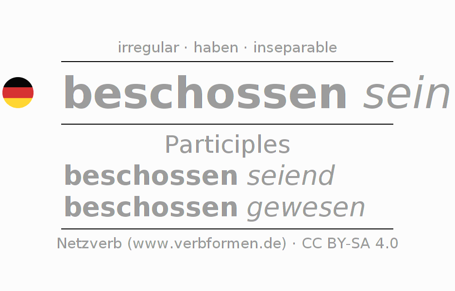 The conjugation of beschießen in Participle Present Perfect part of speech Statal Passive is beschossen seiend, beschossen gewesen.The conjugation corresponds to certain grammatical rules. Likewise the requirements for the conjugation of the simple verb forms of beschießen in Participle. Comments ☆