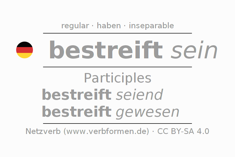 The conjugation of bestreifen in Participle Present Perfect part of speech Statal Passive is bestreift seiend, bestreift gewesen.The conjugation corresponds to certain grammatical rules. Likewise the requirements for the conjugation of the simple verb forms of bestreifen in Participle. Comments ☆