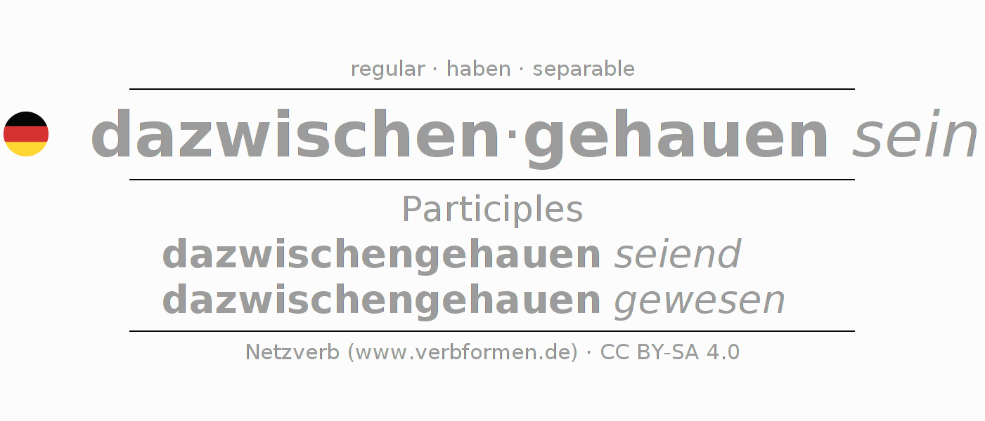 The conjugation of dazwischenhauen in Participle Present Perfect part of speech Statal Passive is dazwischengehau(e)n seiend, dazwischengehau(e)n gewesen.The conjugation corresponds to certain grammatical rules. Likewise the requirements for the conjugation of the simple verb forms of dazwischenhauen in Participle. Comments ☆