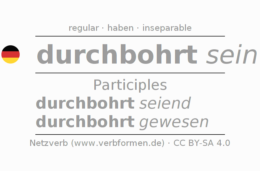 The conjugation of durchbohren in Participle Present Perfect part of speech Statal Passive is durchbohrt seiend, durchbohrt gewesen.The conjugation corresponds to certain grammatical rules. Likewise the requirements for the conjugation of the simple verb forms of durchbohren in Participle. Comments ☆