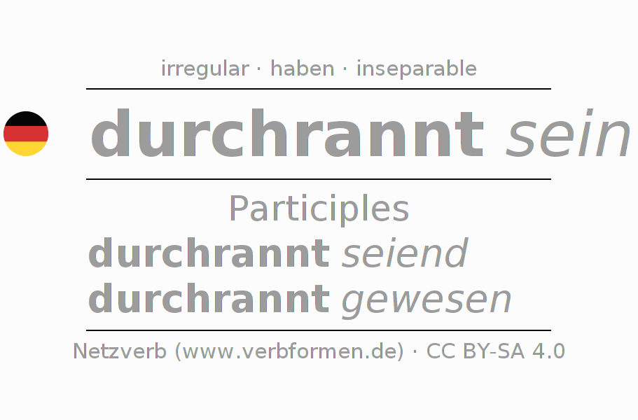 The conjugation of durchrennen in Participle Present Perfect part of speech Statal Passive is durchrannt seiend, durchrannt gewesen.The conjugation corresponds to certain grammatical rules. Likewise the requirements for the conjugation of the simple verb forms of durchrennen in Participle. Comments ☆
