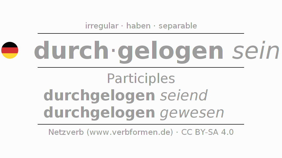 The conjugation of durchlügen in Participle Present Perfect part of speech Statal Passive is durchgelogen seiend, durchgelogen gewesen.The conjugation corresponds to certain grammatical rules. Likewise the requirements for the conjugation of the simple verb forms of durchlügen in Participle. Comments ☆
