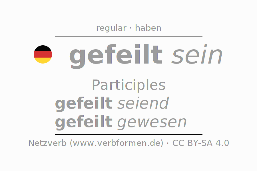 The conjugation of feilen in Participle Present Perfect part of speech Statal Passive is gefeilt seiend, gefeilt gewesen.The conjugation corresponds to certain grammatical rules. Likewise the requirements for the conjugation of the simple verb forms of feilen in Participle. Comments ☆