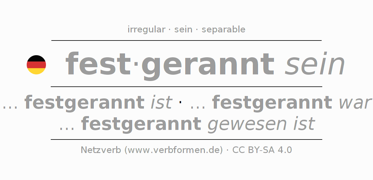 The conjugation of festrennen in Participle Present Perfect part of speech Statal Passive is festgerannt seiend, festgerannt gewesen.The conjugation corresponds to certain grammatical rules. Likewise the requirements for the conjugation of the simple verb forms of festrennen in Participle. Comments ☆