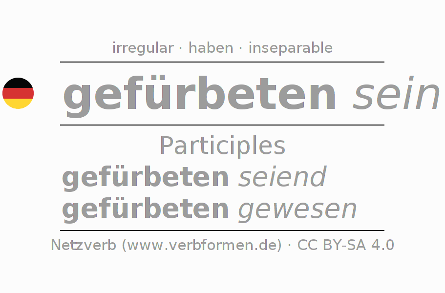 The conjugation of fürbitten in Participle Present Perfect part of speech Statal Passive is gefürbeten seiend, gefürbeten gewesen.The conjugation corresponds to certain grammatical rules. Likewise the requirements for the conjugation of the simple verb forms of fürbitten in Participle. Comments ☆