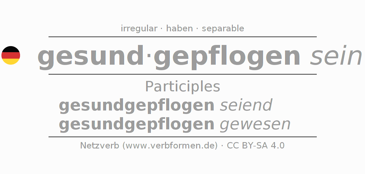 The conjugation of gesundpflegen in Participle Present Perfect part of speech Statal Passive is gesundgepflogen seiend, gesundgepflogen gewesen.The conjugation corresponds to certain grammatical rules. Likewise the requirements for the conjugation of the simple verb forms of gesundpflegen in Participle. Comments ☆