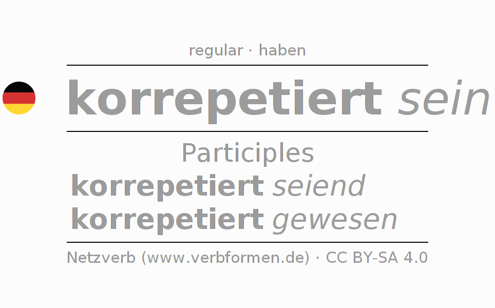 The conjugation of korrepetieren in Participle Present Perfect part of speech Statal Passive is korrepetiert seiend, korrepetiert gewesen.The conjugation corresponds to certain grammatical rules. Likewise the requirements for the conjugation of the simple verb forms of korrepetieren in Participle. Comments ☆