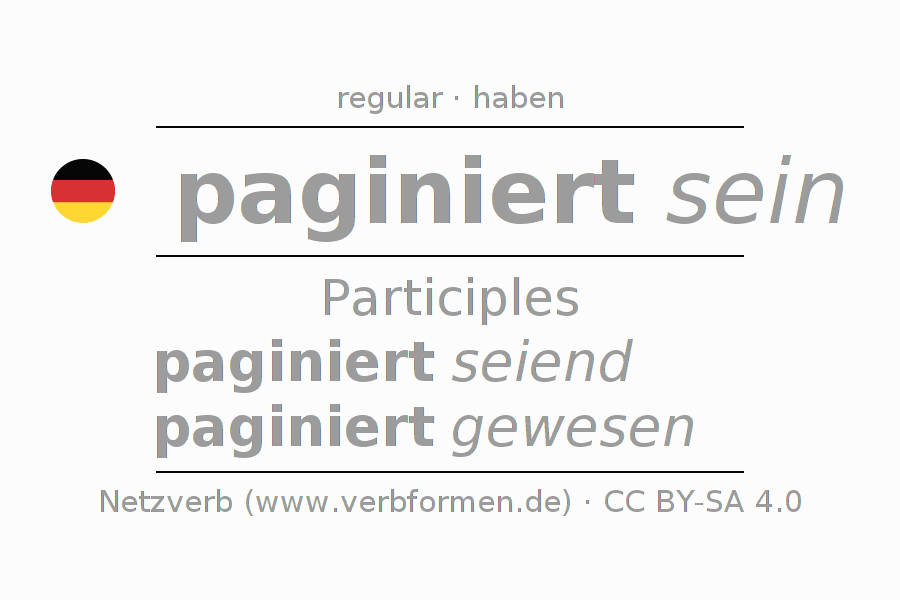 The conjugation of paginieren in Participle Present Perfect part of speech Statal Passive is paginiert seiend, paginiert gewesen.The conjugation corresponds to certain grammatical rules. Likewise the requirements for the conjugation of the simple verb forms of paginieren in Participle. Comments ☆
