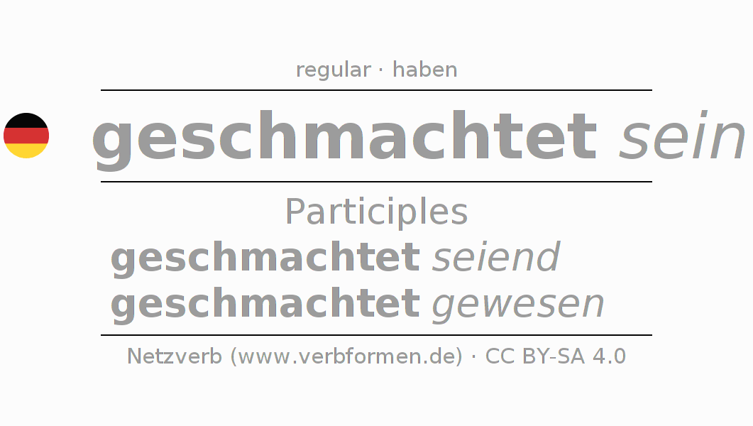 The conjugation of schmachten in Participle Present Perfect part of speech Statal Passive is geschmachtet seiend, geschmachtet gewesen.The conjugation corresponds to certain grammatical rules. Likewise the requirements for the conjugation of the simple verb forms of schmachten in Participle. Comments ☆