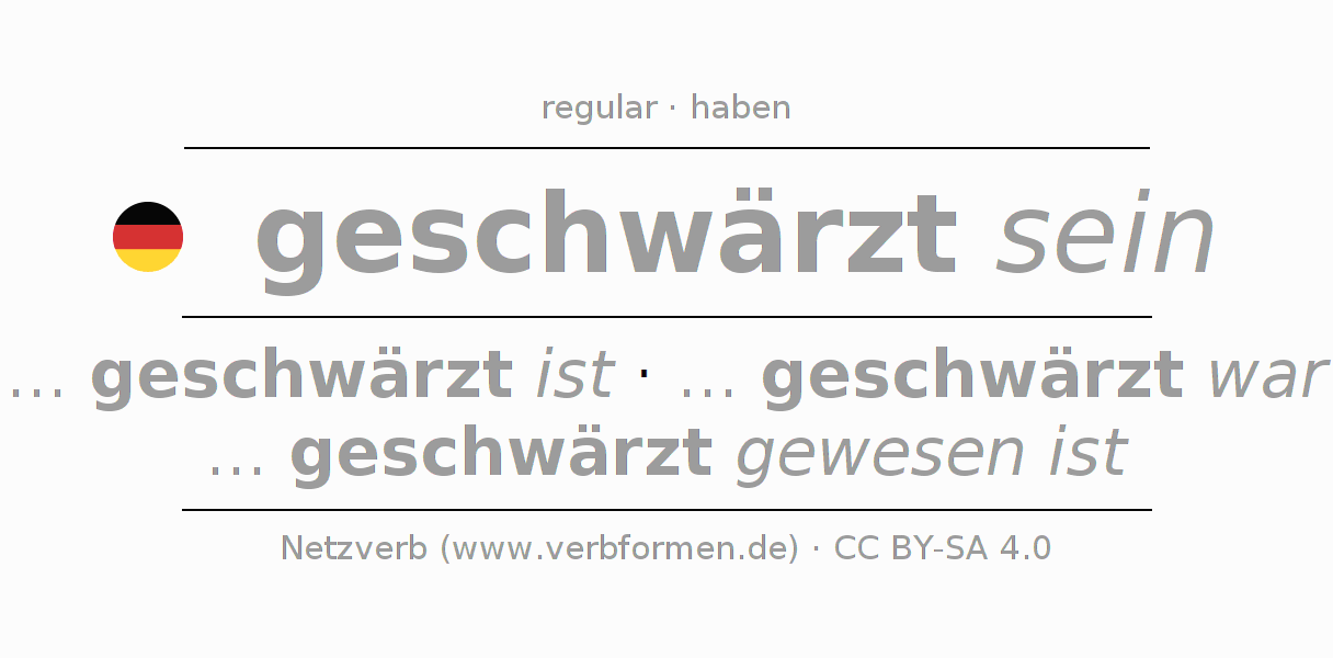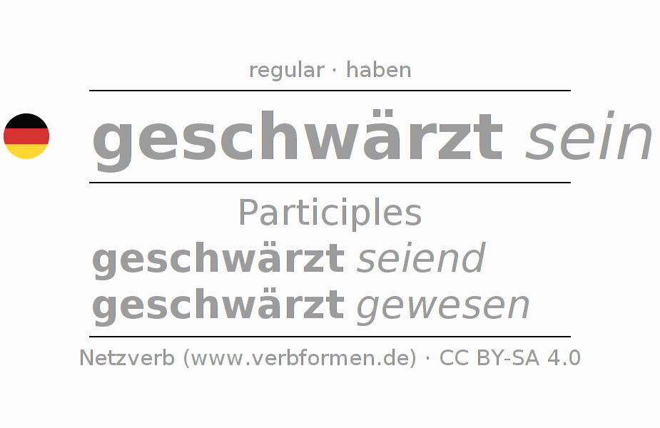 The conjugation of schwärzen in Participle Present Perfect part of speech Statal Passive is geschwärzt seiend, geschwärzt gewesen.The conjugation corresponds to certain grammatical rules. Likewise the requirements for the conjugation of the simple verb forms of schwärzen in Participle. Comments ☆