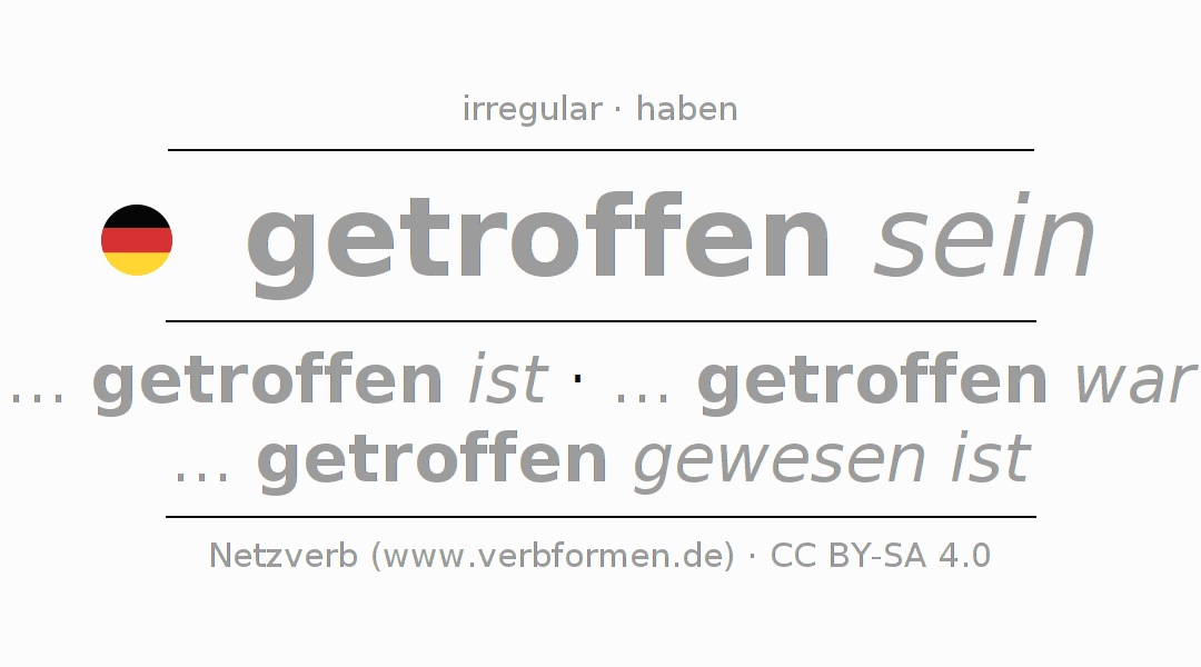 The conjugation of treffen in Participle Present Perfect part of speech Statal Passive is getroffen seiend, getroffen gewesen.The conjugation corresponds to certain grammatical rules. Likewise the requirements for the conjugation of the simple verb forms of treffen in Participle. Comments ☆
