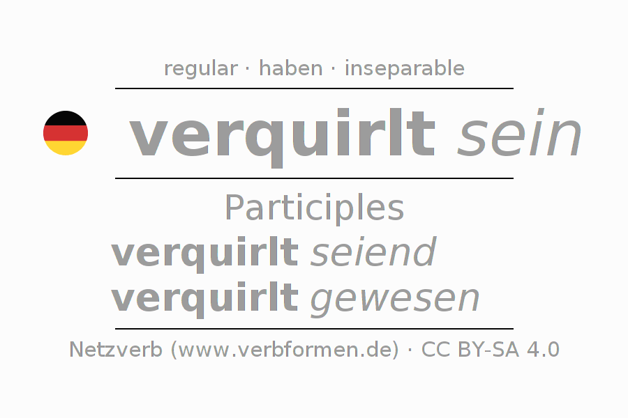 The conjugation of verquirlen in Participle Present Perfect part of speech Statal Passive is verquirlt seiend, verquirlt gewesen.The conjugation corresponds to certain grammatical rules. Likewise the requirements for the conjugation of the simple verb forms of verquirlen in Participle. Comments ☆