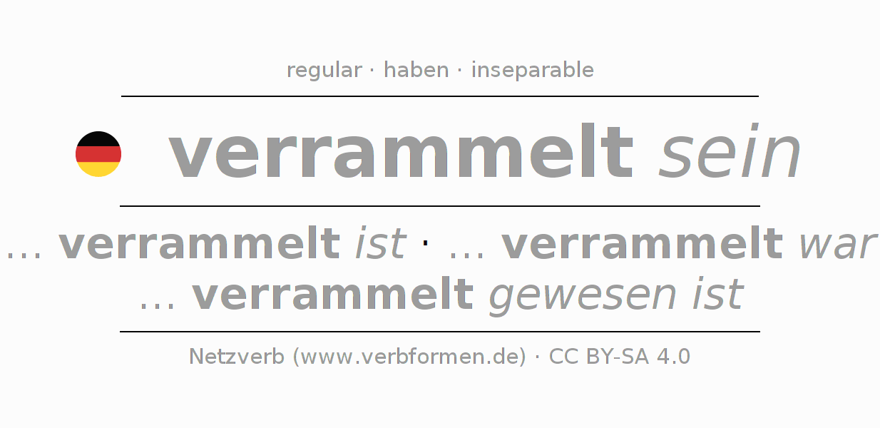 The verb verrammeln fully conjugated in all persons and numbers in the Participle Present Perfect
