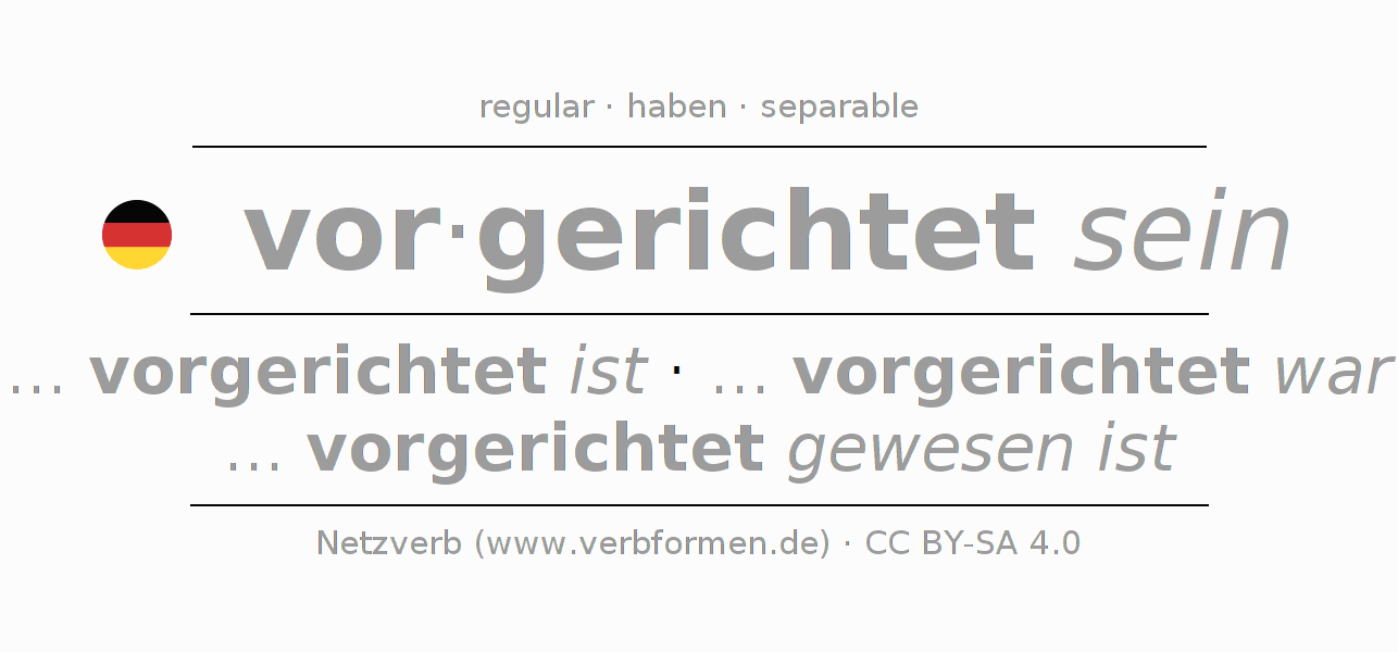The conjugation of vorrichten in Participle Present Perfect part of speech Statal Passive is vorgerichtet seiend, vorgerichtet gewesen.The conjugation corresponds to certain grammatical rules. Likewise the requirements for the conjugation of the simple verb forms of vorrichten in Participle. Comments ☆