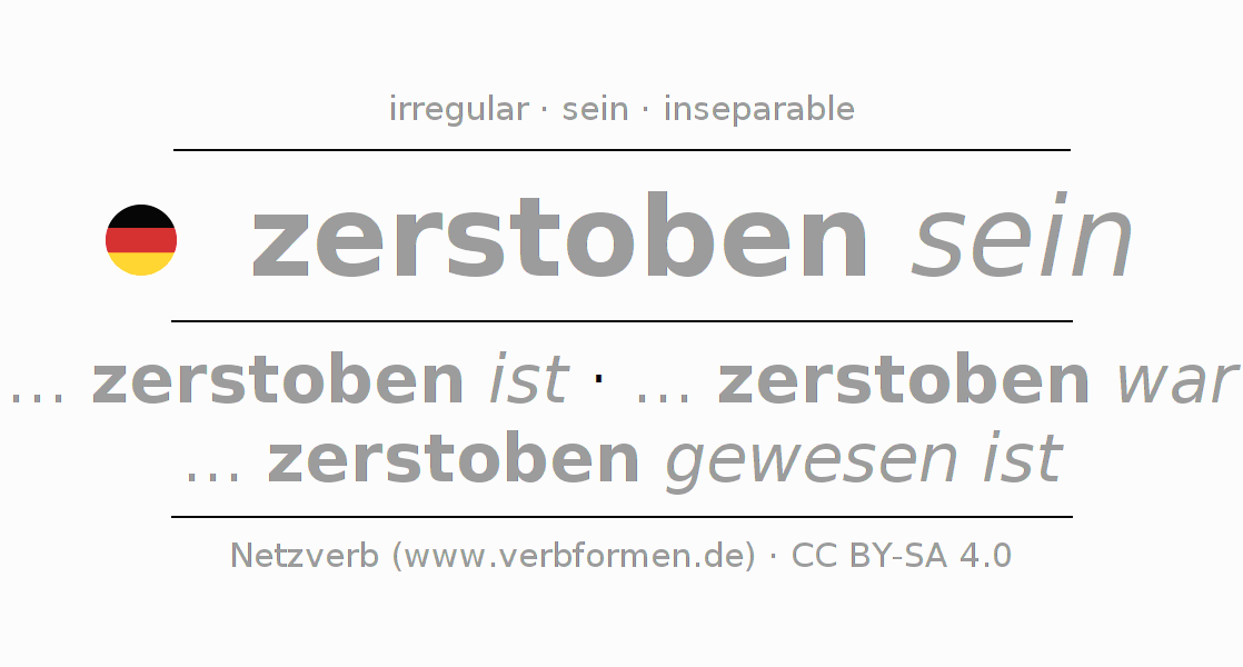 The conjugation of zerstieben in Participle Present Perfect part of speech Statal Passive is zerstoben seiend, zerstoben gewesen.The conjugation corresponds to certain grammatical rules. Likewise the requirements for the conjugation of the simple verb forms of zerstieben in Participle. Comments ☆