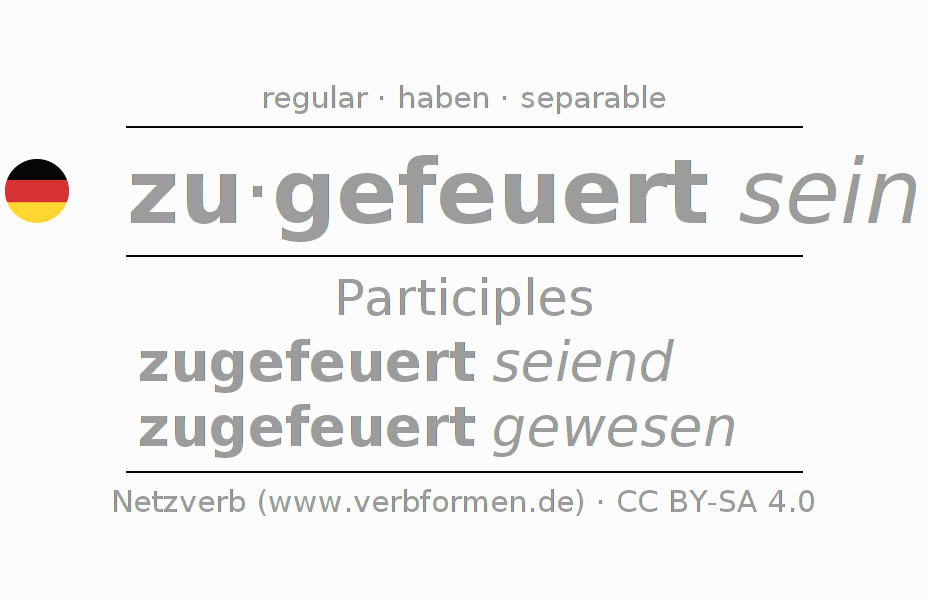 The conjugation of zufeuern in Participle Present Perfect part of speech Statal Passive is zugefeuert seiend, zugefeuert gewesen.The conjugation corresponds to certain grammatical rules. Likewise the requirements for the conjugation of the simple verb forms of zufeuern in Participle. Comments ☆