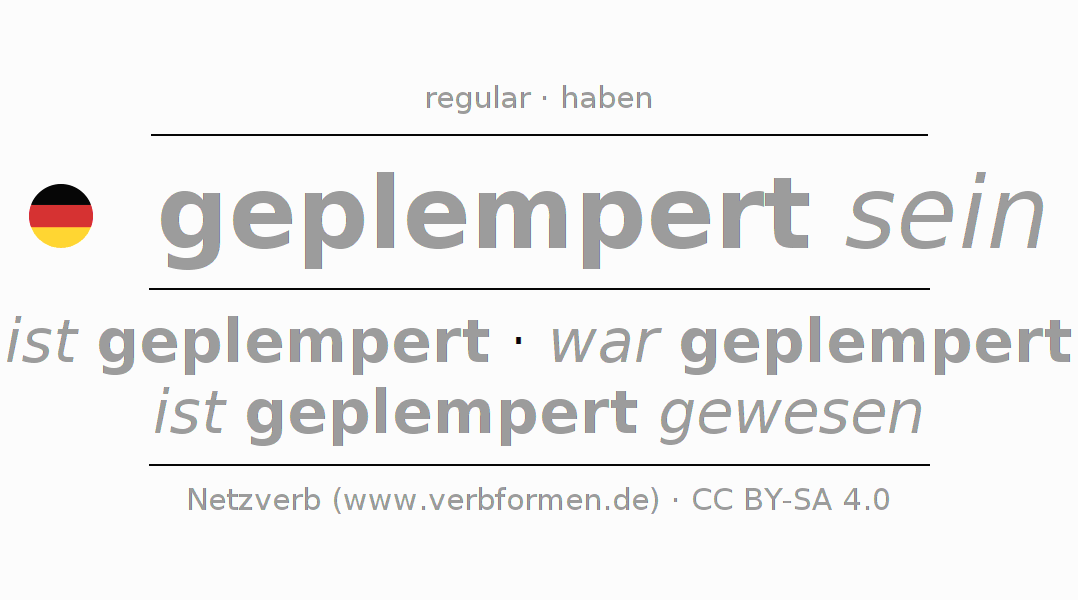 The conjugation of plempern in Participle Present Perfect part of speech Statal Passive is geplempert seiend, geplempert gewesen.The conjugation corresponds to certain grammatical rules. Likewise the requirements for the conjugation of the simple verb forms of plempern in Participle. Comments ☆