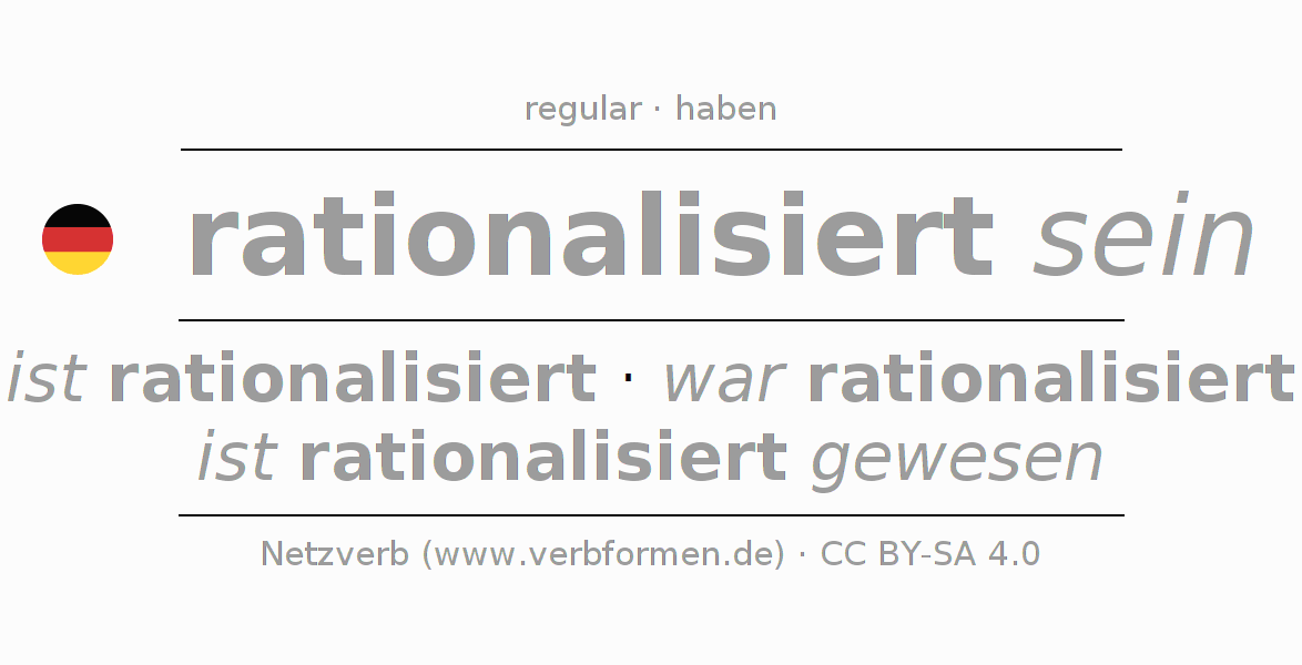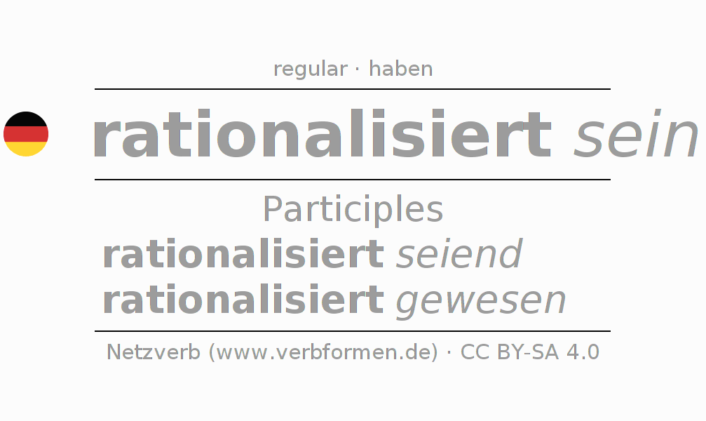 The conjugation of rationalisieren in Participle Present Perfect part of speech Statal Passive is rationalisiert seiend, rationalisiert gewesen.The conjugation corresponds to certain grammatical rules. Likewise the requirements for the conjugation of the simple verb forms of rationalisieren in Participle. Comments ☆