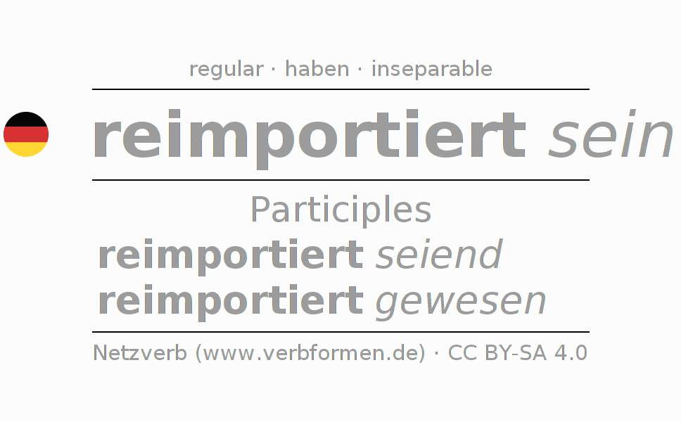 The conjugation of reimportieren in Participle Present Perfect part of speech Statal Passive is reimportiert seiend, reimportiert gewesen.The conjugation corresponds to certain grammatical rules. Likewise the requirements for the conjugation of the simple verb forms of reimportieren in Participle. Comments ☆