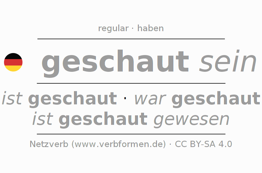 The conjugation of schauen in Participle Present Perfect part of speech Statal Passive is geschaut seiend, geschaut gewesen.The conjugation corresponds to certain grammatical rules. Likewise the requirements for the conjugation of the simple verb forms of schauen in Participle. Comments ☆