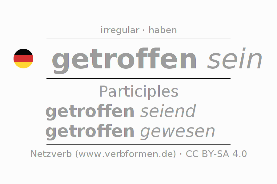 The conjugation of treffen in Participle Present Perfect part of speech Statal Passive is getroffen seiend, getroffen gewesen.The conjugation corresponds to certain grammatical rules. Likewise the requirements for the conjugation of the simple verb forms of treffen in Participle. Comments ☆