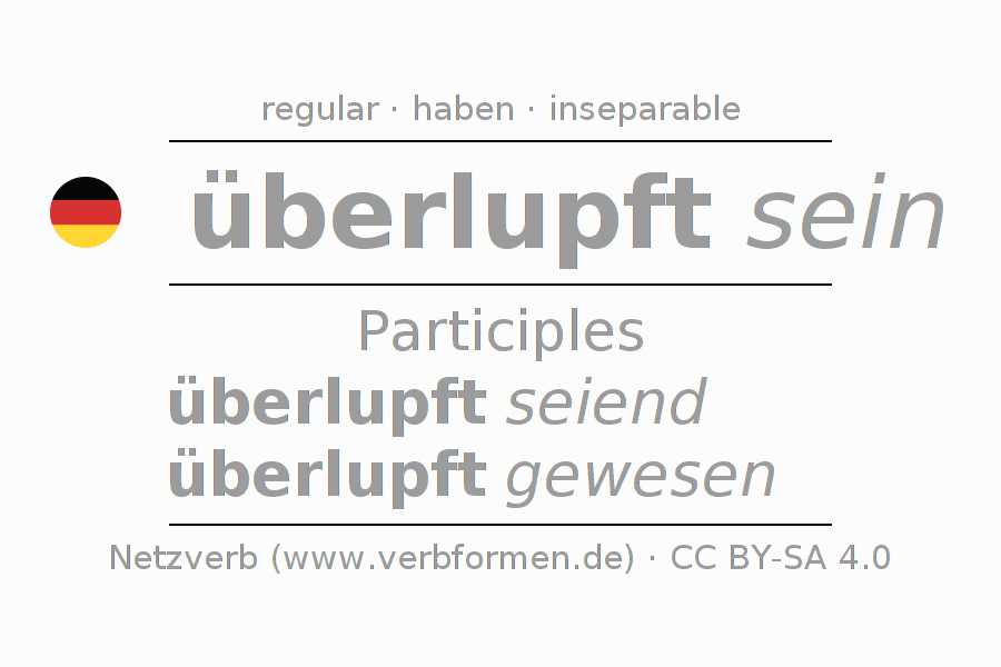 The conjugation of überlupfen in Participle Present Perfect part of speech Statal Passive is überlupft seiend, überlupft gewesen.The conjugation corresponds to certain grammatical rules. Likewise the requirements for the conjugation of the simple verb forms of überlupfen in Participle. Comments ☆
