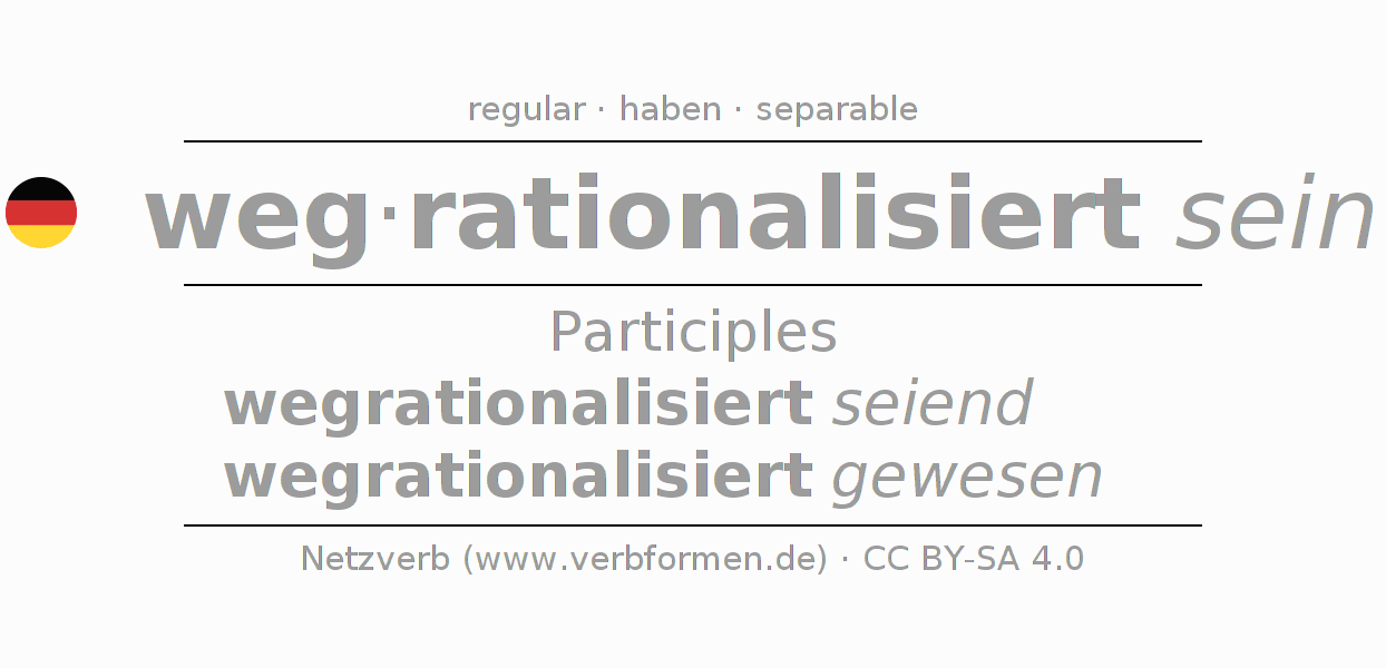 The conjugation of wegrationalisieren in Participle Present Perfect part of speech Statal Passive is wegrationalisiert seiend, wegrationalisiert gewesen.The conjugation corresponds to certain grammatical rules. Likewise the requirements for the conjugation of the simple verb forms of wegrationalisieren in Participle. Comments ☆