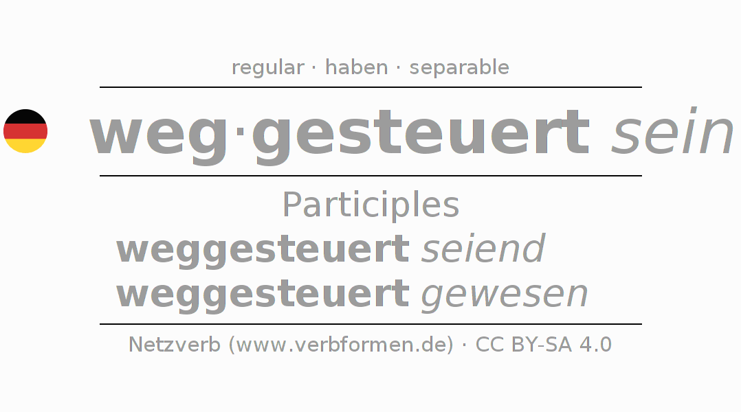 The conjugation of wegsteuern in Participle Present Perfect part of speech Statal Passive is weggesteuert seiend, weggesteuert gewesen.The conjugation corresponds to certain grammatical rules. Likewise the requirements for the conjugation of the simple verb forms of wegsteuern in Participle. Comments ☆