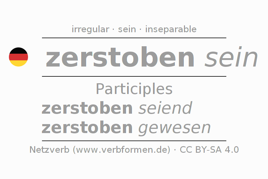 The conjugation of zerstieben in Participle Present Perfect part of speech Statal Passive is zerstoben seiend, zerstoben gewesen.The conjugation corresponds to certain grammatical rules. Likewise the requirements for the conjugation of the simple verb forms of zerstieben in Participle. Comments ☆