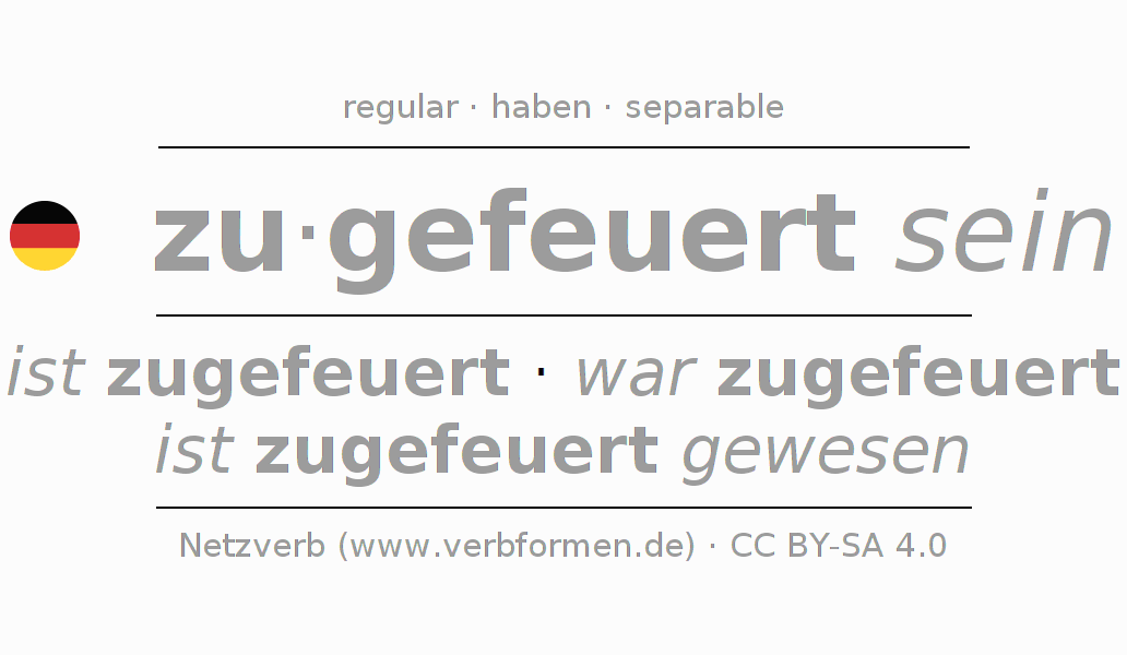 The conjugation of zufeuern in Participle Present Perfect part of speech Statal Passive is zugefeuert seiend, zugefeuert gewesen.The conjugation corresponds to certain grammatical rules. Likewise the requirements for the conjugation of the simple verb forms of zufeuern in Participle. Comments ☆