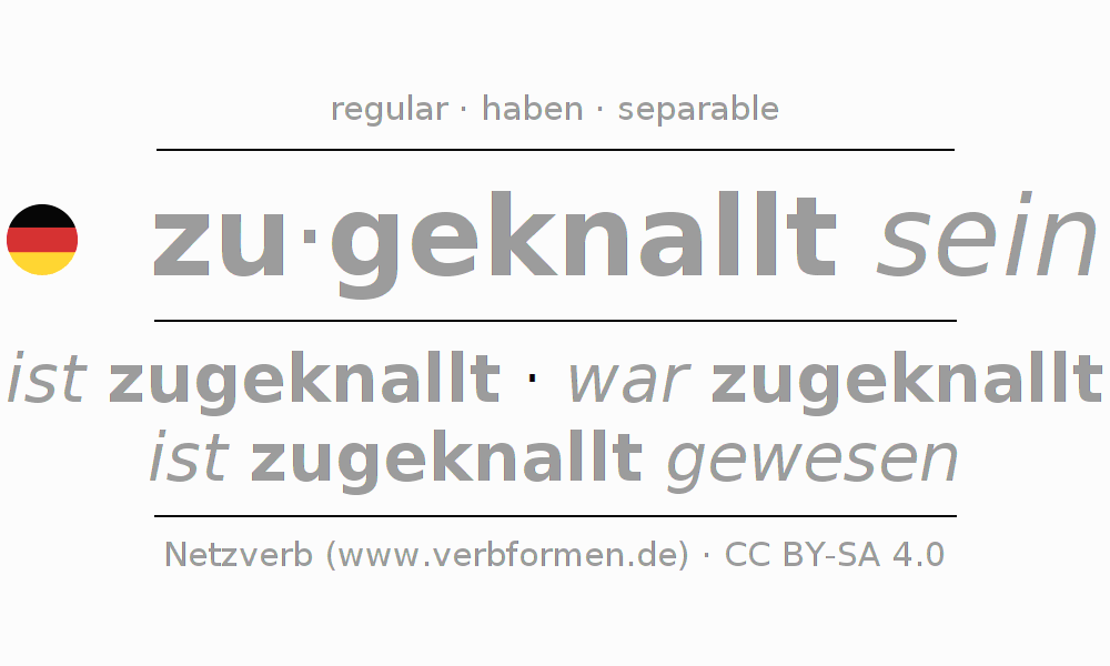 The verb zuknallen (hat) fully conjugated in all persons and numbers in the Participle Present Perfect