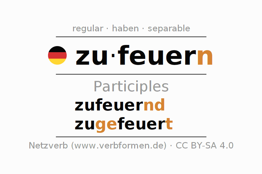 The verb zufeuern fully conjugated in all persons and numbers in the Participle Present Perfect