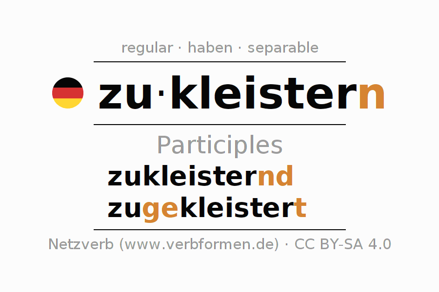 The verb zukleistern fully conjugated in all persons and numbers in the Participle Present Perfect