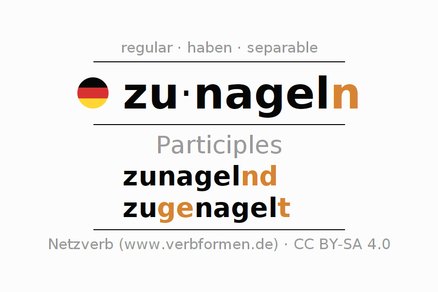 The verb zunageln fully conjugated in all persons and numbers in the Participle Present Perfect