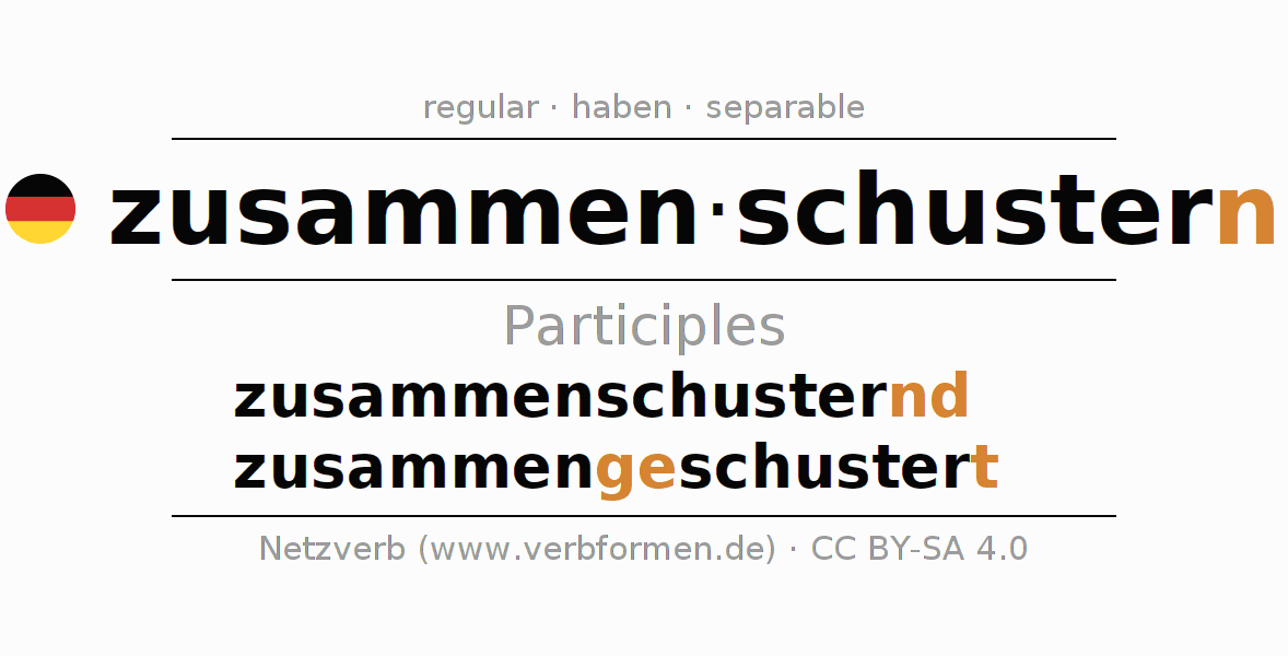 The verb zusammenschustern fully conjugated in all persons and numbers in the Participle Present Perfect
