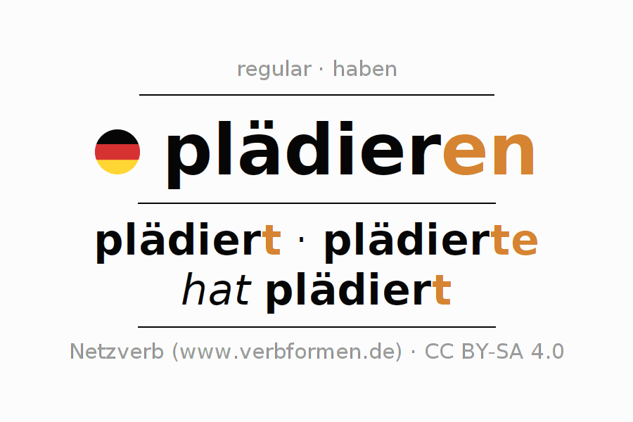 - Future: ich werde plädieren, du wirst plädieren, er wird plädieren, wir werden plädieren, ihr werdet plädieren, sie werden plädieren