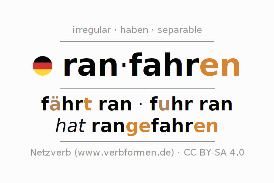 - Future: ich werde ranfahren, du wirst ranfahren, er wird ranfahren, wir werden ranfahren, ihr werdet ranfahren, sie werden ranfahren