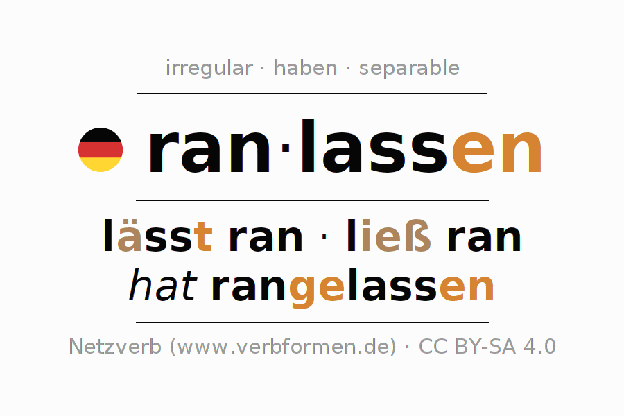 Clear online presentation of the verb 'ran·lassen' including all verb forms. Therfore, the flection of the verb ran·lassen can be useful for homework, tests, exams, German lessons in school, learning German, during studies and adult education. Especially for people learning German it is essential to know the correct flection of a verb (lässt ran - ließ ran - hat rangelassen).