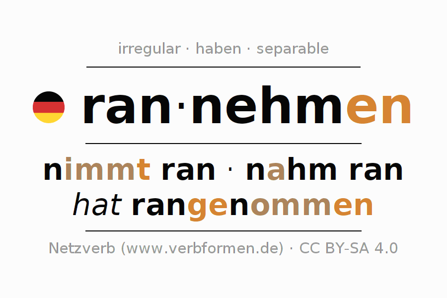 Clear online presentation of the verb 'ran·nehmen' including all verb forms. Therfore, the flection of the verb ran·nehmen can be useful for homework, tests, exams, German lessons in school, learning German, during studies and adult education. Especially for people learning German it is essential to know the correct flection of a verb (nimmt ran - nahm ran - hat rangenommen).