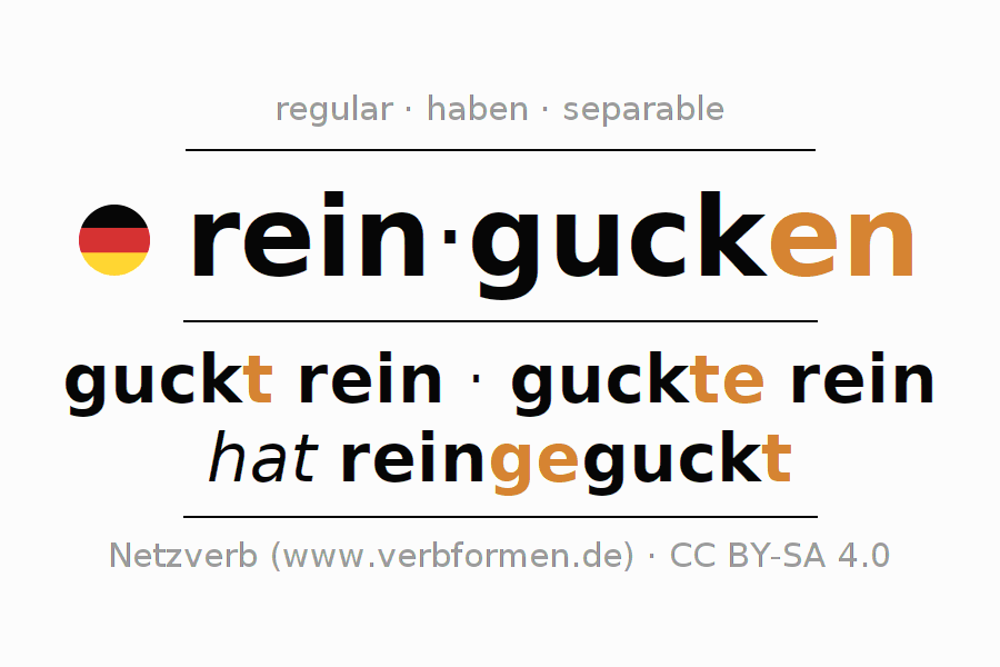 - Perfect: ich habe reingeguckt, du hast reingeguckt, er hat reingeguckt, wir haben reingeguckt, ihr habt reingeguckt, sie haben reingeguckt