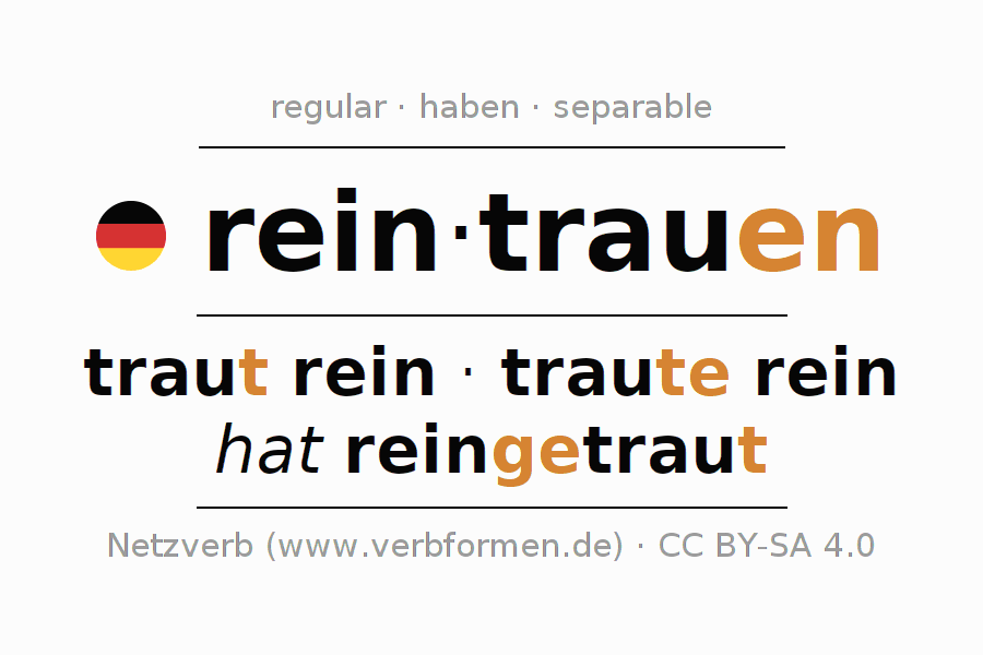 Clear online presentation of the verb 'rein·trauen' including all verb forms. Therfore, the flection of the verb rein·trauen can be useful for homework, tests, exams, German lessons in school, learning German, during studies and adult education. Especially for people learning German it is essential to know the correct flection of a verb (traut rein - traute rein - hat reingetraut).