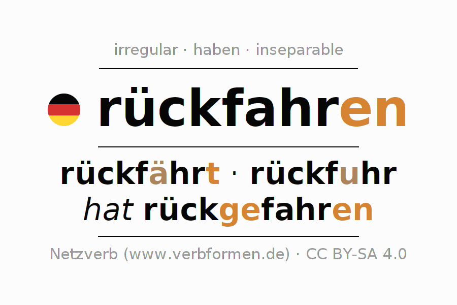 - Future: ich werde rückfahren, du wirst rückfahren, er wird rückfahren, wir werden rückfahren, ihr werdet rückfahren, sie werden rückfahren