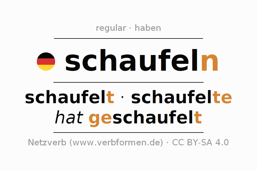 - Future: ich werde schaufeln, du wirst schaufeln, er wird schaufeln, wir werden schaufeln, ihr werdet schaufeln, sie werden schaufeln