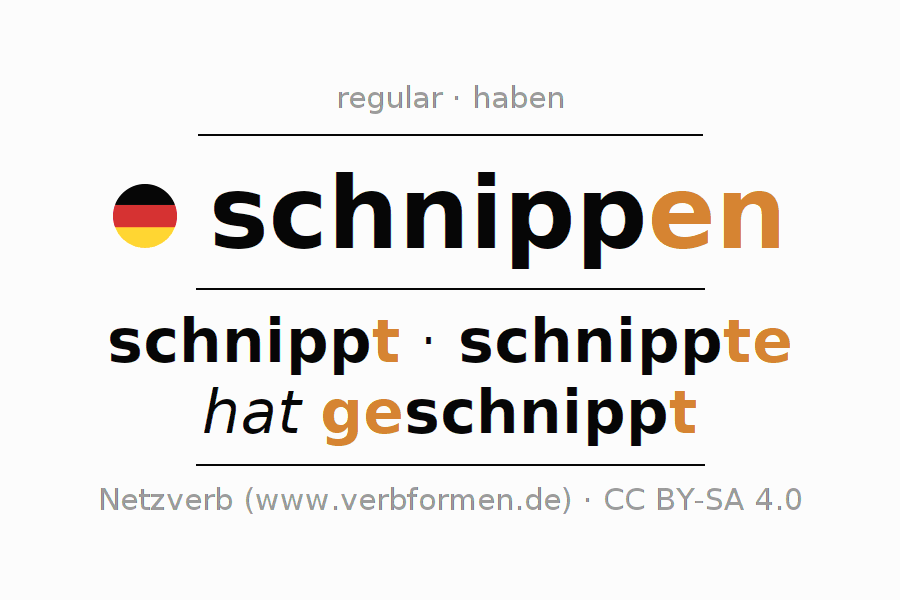 Clear online presentation of the verb 'schnippen' including all verb forms. Therfore, the flection of the verb schnippen can be useful for homework, tests, exams, German lessons in school, learning German, during studies and adult education. Especially for people learning German it is essential to know the correct flection of a verb (schnippt - schnippte - hat geschnippt).