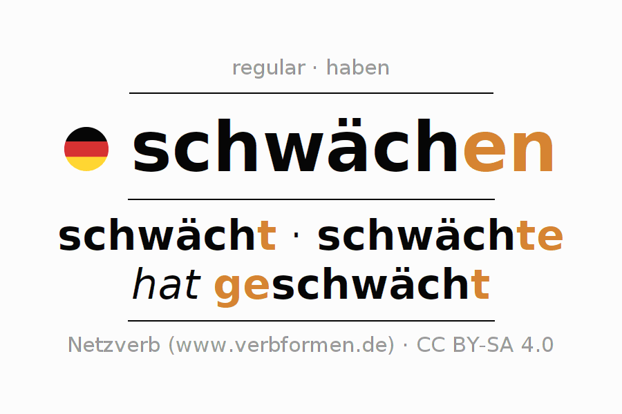 - Present: schwäch(e) (du), schwächen wir, schwächt (ihr), schwächen Sie