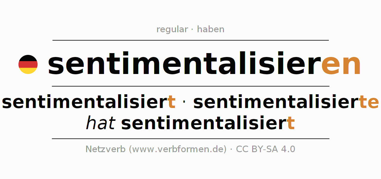 - Present: sentimentalisier(e) (du), sentimentalisieren wir, sentimentalisiert (ihr), sentimentalisieren Sie