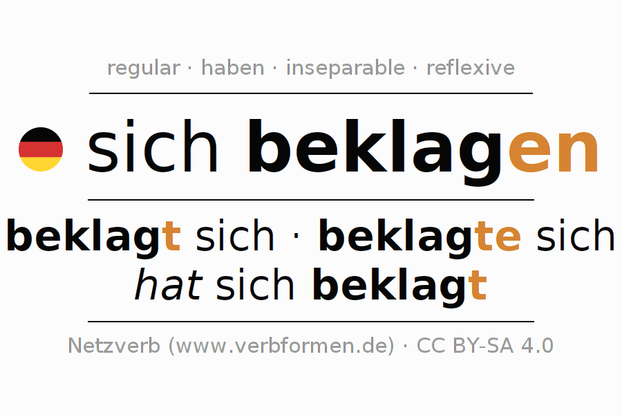 Clear online presentation of the verb 'sich beklagen' including all verb forms. Therfore, the flection of the verb sich beklagen can be useful for homework, tests, exams, German lessons in school, learning German, during studies and adult education. Especially for people learning German it is essential to know the correct flection of a verb (beklagt sich - beklagte sich - hat sich beklagt).